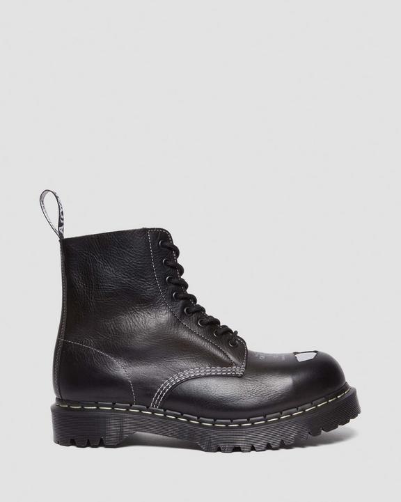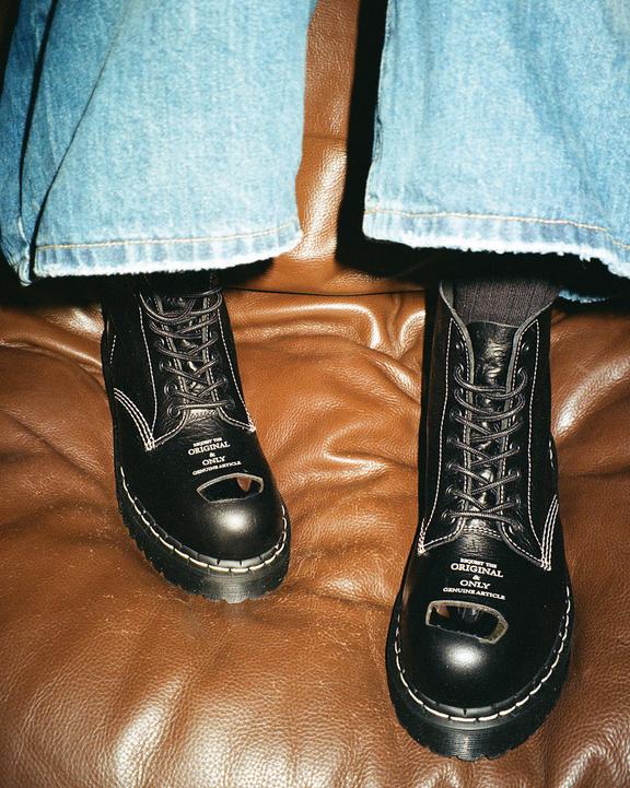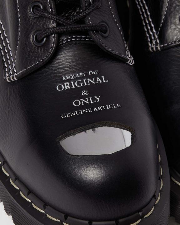 Designed to let our craftsmanship do the talking. This 1460 8-eye boot is built from waxy Overdrive leather and stands on an exaggerated smoke Bex sole with a rugged cleated tread. The boot has an exposed steel toe cap and print detailing inspired by a DM’s marketing slogan found in our archive that reads: REQUEST THE ORIGINAL & ONLY GENUINE ARTICLE. Our signature contrast welt stitching stands out in white against a notched black welt. The boot’s upper is detailed with heavy white stitching and tagged with a black and white heel loop.