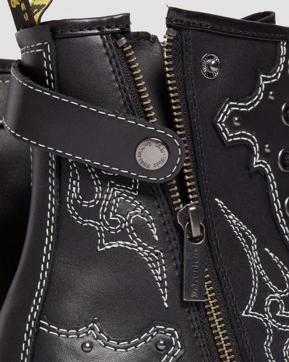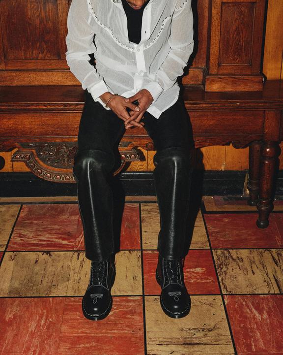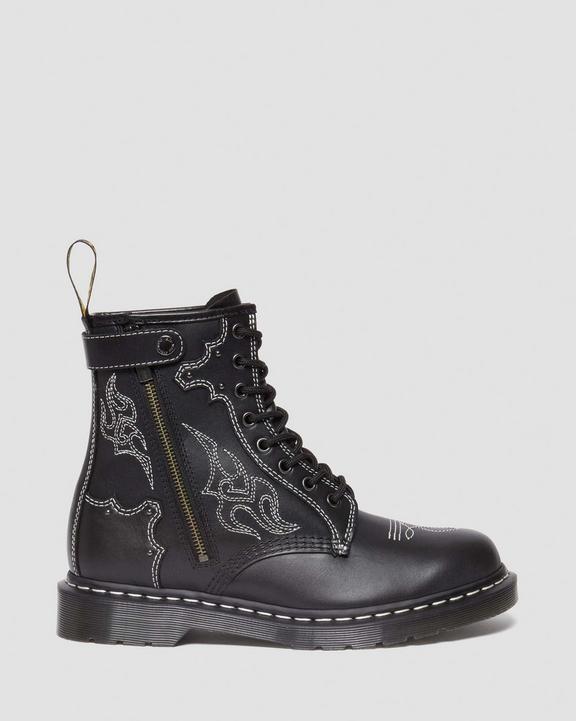 Never follow fashion. Subvert and disrupt it. The 1460 boot casts a shadow over traditional country and western styling with an infusion of 80s Gothic subculture. Constructed from lightweight black Wanama leather for an easy break-in. The 8-eye boot is fitted with an ankle zip secured with an upper strap for easy-on easy-off access. The 1460 boot is highlighted with contrast white embroidery and welt stitch. Finished with an AirWair scripted heel loop and classic smoke DMS sole.