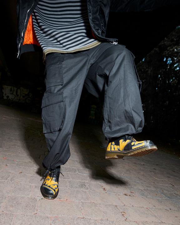 Inspired by packaging from the 80s. This new version of our 1461 shoe is decorated with artwork from a DM’s shoe box from the mid to late 80s with a prominent AirWair script. The shoe is built from Vintage Smooth leather and tagged with a black and yellow heel loop. The grooved outsole is punched with classic DM’s yellow welt stitching.
