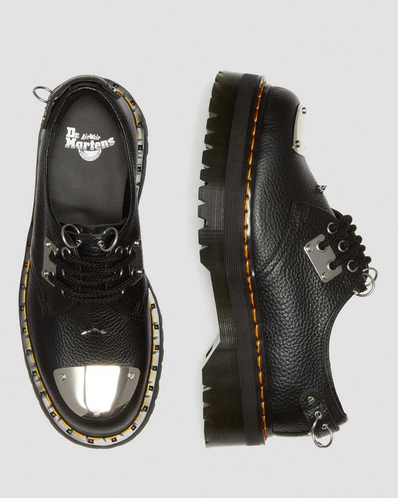 Unmistakable punk heritage. Adorned from heel to toe with shiny silver trims, metal plates and barbell hardware inspired by decades of unconventional piercings. The reworked 1461 shoe is stacked on our Quad sole, secured by a black welt with pyramid studding and yellow welt stitching. The upper is built from soft Milled Nappa leather with black stitching and fitted with black cord laces.