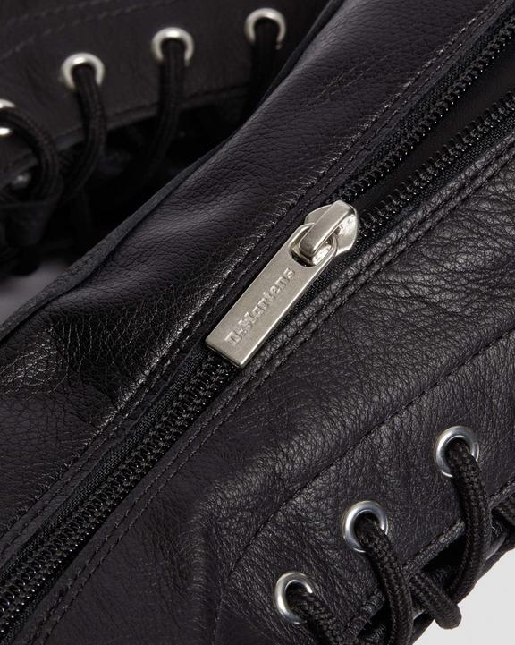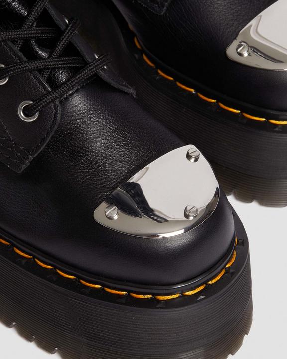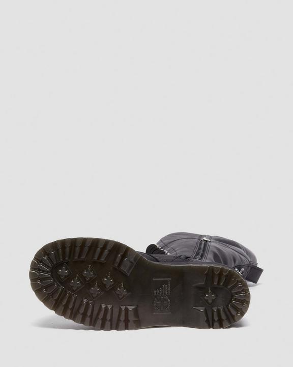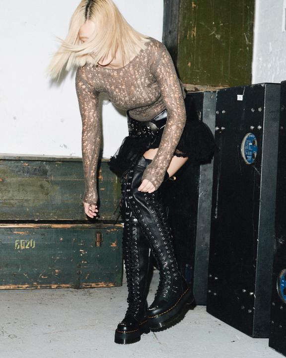 This towering 28-eyelet boot is built from soft Virginia leather and Tumble Stretch PU and covered in unmissable hardware from top to sole. Stacked on our tallest Quad Max sole and fitted with shiny silver eyelets, a toecap plate, and barbell detailing. Fully adjustable front and side lacing for a customized fit and an inside zip for easy on-off wear. The boot is tagged with double black and yellow heel loops, and the sole is secured with our signature yellow welt stitching.