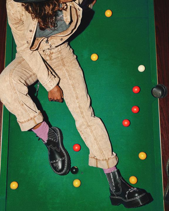 Never follow fashion. Subvert and disrupt it. The 2976 Chelsea boot casts a shadow over traditional country and western styling with an infusion of 80s Gothic subculture. Constructed from lightweight black Wanama leather for an easy break-in. The classic Chelsea boot is fitted an easy-on easy-off elasticated panel. The 2976 boot is highlighted with contrast white embroidery and double welt stitch. Finished with an AirWair scripted heel loop and stacked smoke Quad sole.