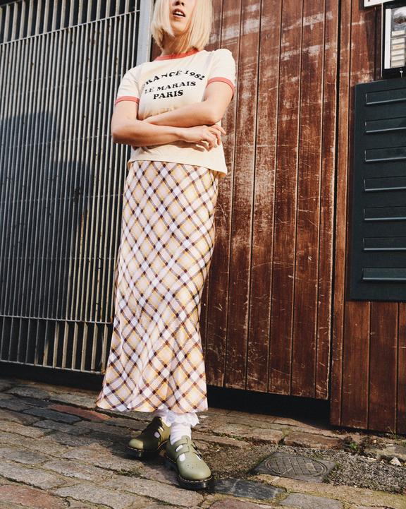 Neutral summer tones — worn in from the first step, so you can make the most of the longer days. We've built our grunge-essential 8065 Mary Jane shoe using soft, pebbled Virginia leather. The shoe is made with over 6 decades of DM's construction heritage: welted on a translucent grooved DMS outsole and secured with our signature yellow welt stitching. The two-buckle silhouette is detailed with antique gold hardware and a subtle bitter choc welt.