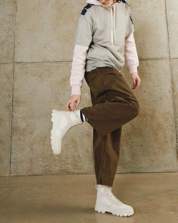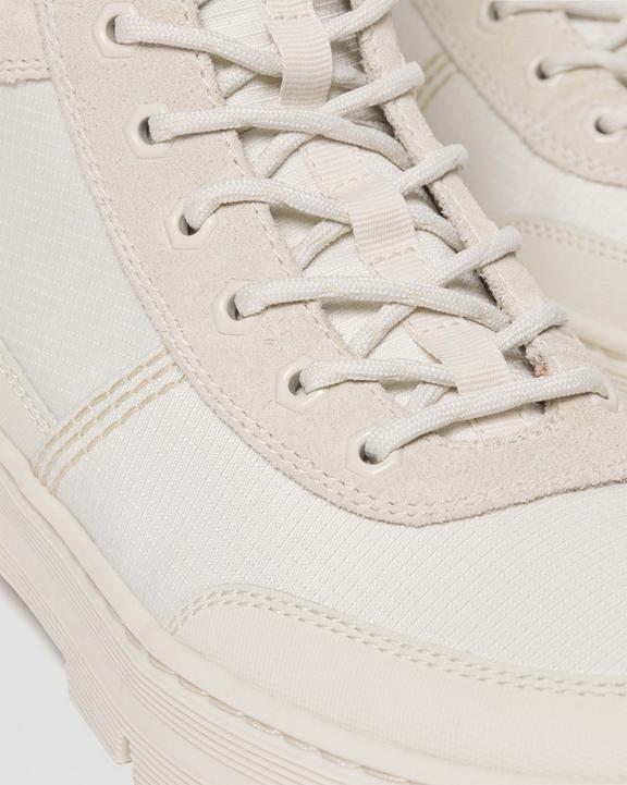 Our off-white Combs Tech boot will add a new versatile shade to your line-up. Built from a mix of Poly Ripstop, Ajax leather and EH Suede, they come in heel-to-toe off-white down to the solid off-white outsole. The Combs Tech boot is a contemporary take on our Original 8-eye silhouette, fitted with a strap around the ankle for a secure fit. Each pair is detailed with a tonal heel loop and updated contemporary hardware.