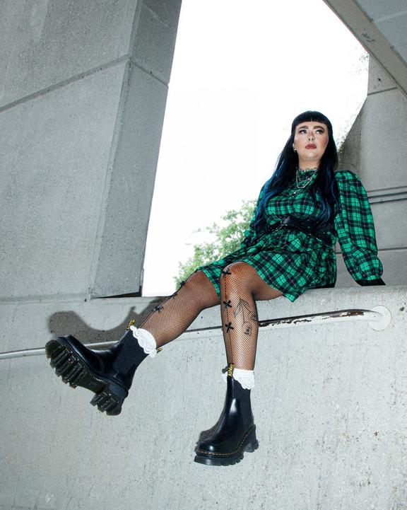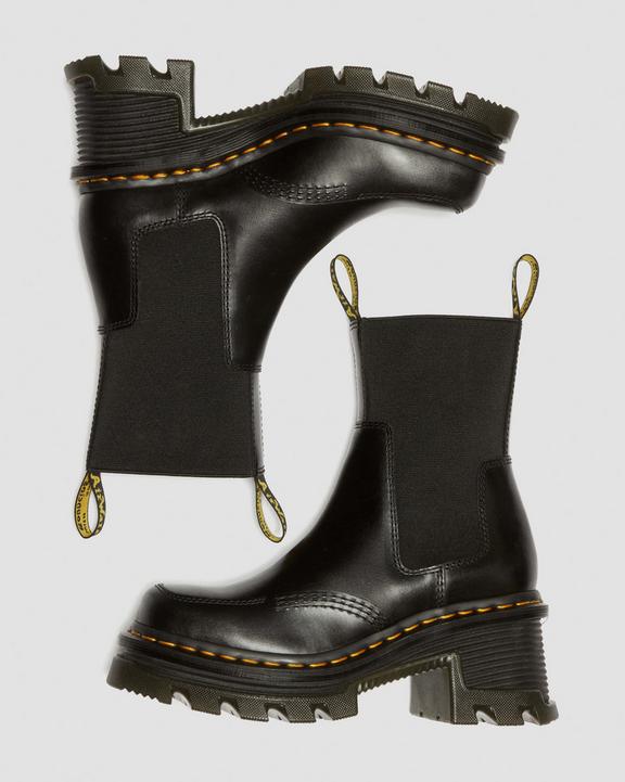 Heels — our way. Our new chunky heel is unmistakably DM’s, with exaggerated lugging and a grooving pattern to mirror our signature DMS outsole. This extra-high Chelsea boot is built from Atlas leather with a flexible elasticated gusset with a double black and yellow heel loop for easy on-off wear. The boot is detailed with tonal stitching and has a distinctive square toe shape. The new statement sole is marked as DM’s with our signature yellow welt stitching.