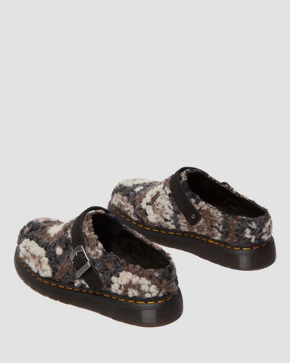 Mules. Remixed. Named after a small village close to the original Dr Martens factory in Northamptonshire, the Isham mule is a slip-on, slip-off style that is versatile and easy to wear. This season we’ve added texture and dimension using EH Suede and a new Crochet Wool in black. The mule has an adjustable strap with tonal hardware and stands on our durable Shore sole. Finished with our signature yellow welt stitching.