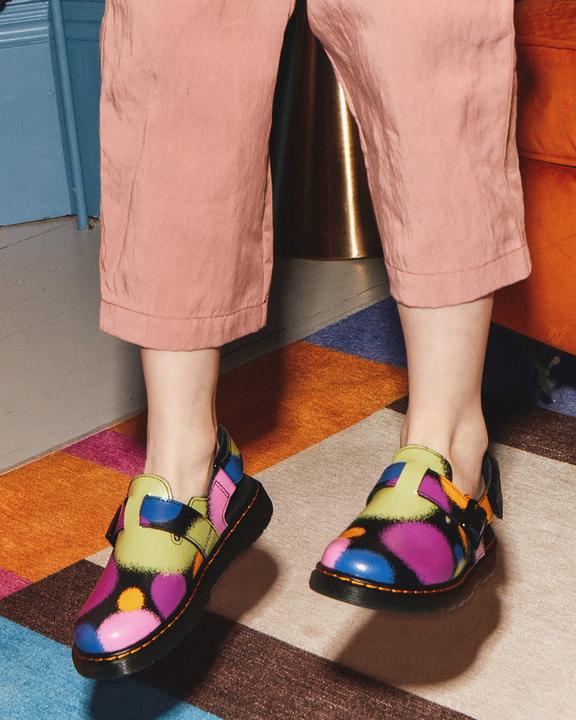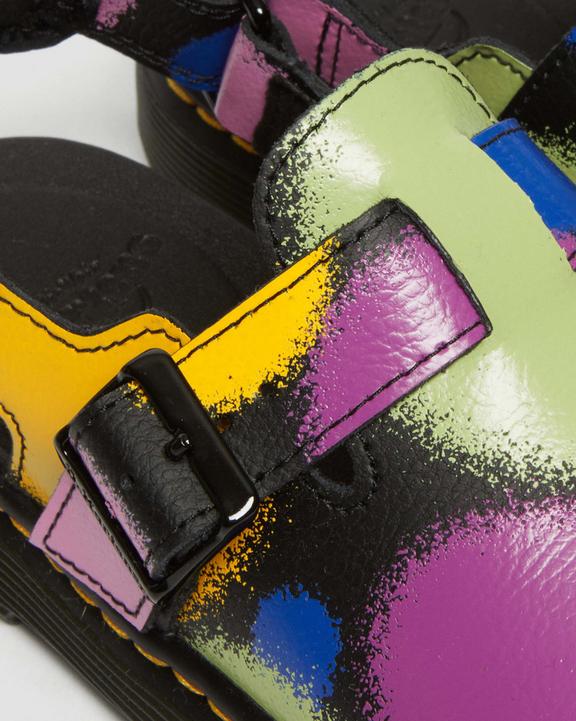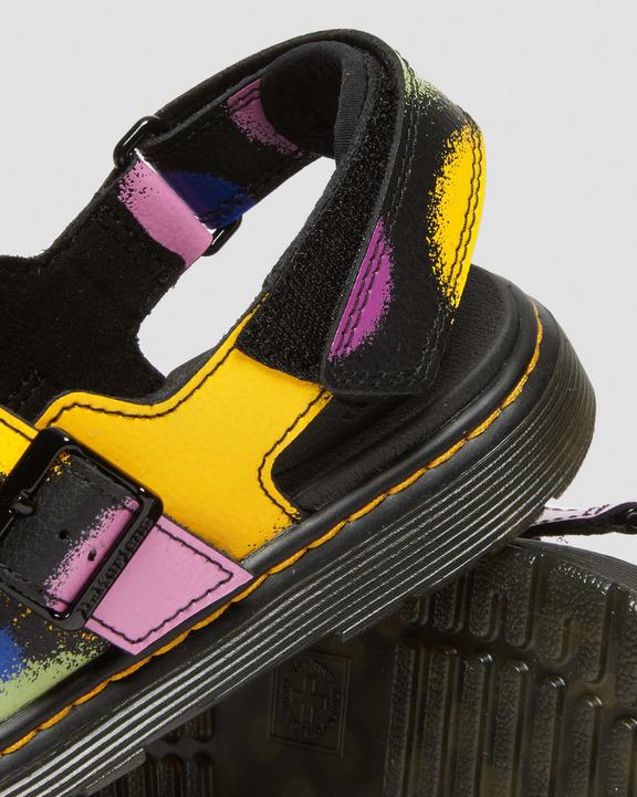 A mule ready for creative mini rebels. The slip-on Jorgie Multi Haze is built from black Hydro, a PU-coated leather that's soft to the touch without compromising durability. Covered heel-to-toe in a multi-colored spray paint pattern inspired by the artists who create whilst rocking their Doc's footwear. The fit is adjusted by the single buckle. With extra comfort from the padded ankle strap and SoftWair footed. Set on an easy-going Shore outsole and highlighted with our signature yellow stitch.