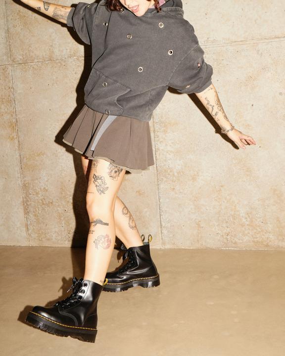 It's your time to shine: We took the towering double-height commando sole of the Quad Retro woman's boot, and powered it up with supple, satin-gloss leather and oversized eyelets with ribbon laces.
