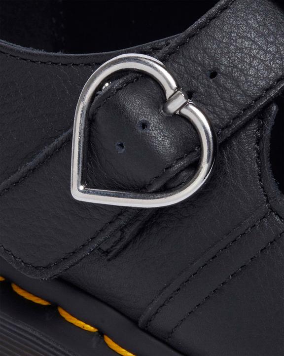 Attitude at heart. Tough DM’s silhouettes meet soft satin hearts. Built from grained Virginia leather that feels soft with minimal break in, the new version of our Polley Mary Jane shoe is welted on a smoke Bex sole punched with our yellow welt stitching. The satin hearts come in contrast frosted lavender which is mirrored in the backstrap.