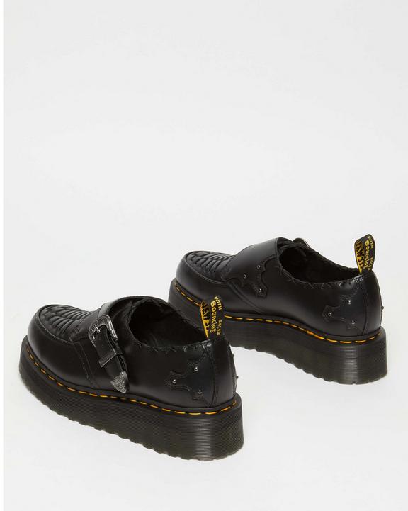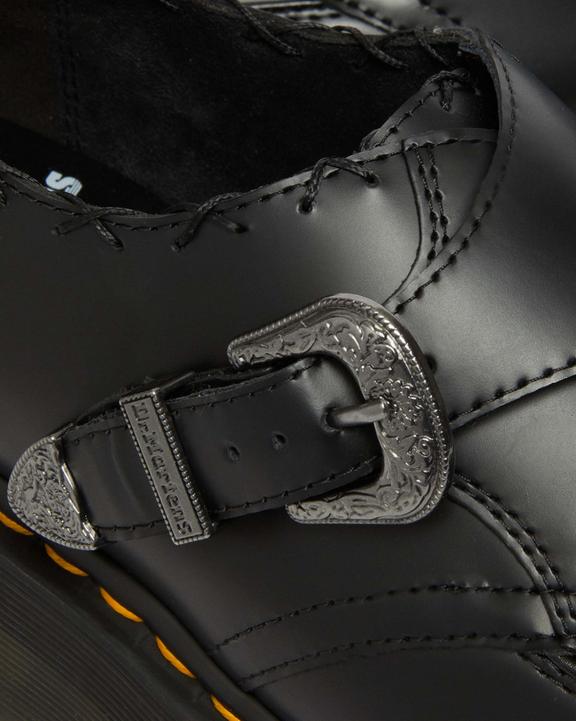 Long adopted by experimental subcultures from Teddy Boys to punks, the creeper has been part of Doc's history for decades. This detail-packed rework of our Ramsey creeper is stacked on an unmissable Quad wedge sole and built with Smooth leather. The creeper has classic weave detailing on the vamp and is fitted with a traditional Monk strap secured with an archive-inspired buckle. The upper is marked with stitch detailing and gunmetal studs. The creeper is tagged with our black and yellow heel loop and punched with signature yellow welt stitching.