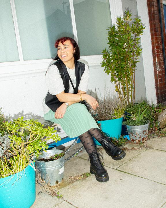One of our headliners — our towering Sinclair is kitted out with a removable jungle piece zip, yellow welt stitching and tons of Docs attitude. Standing on a towering Quad platform sole, these boots are not for the faint-hearted.