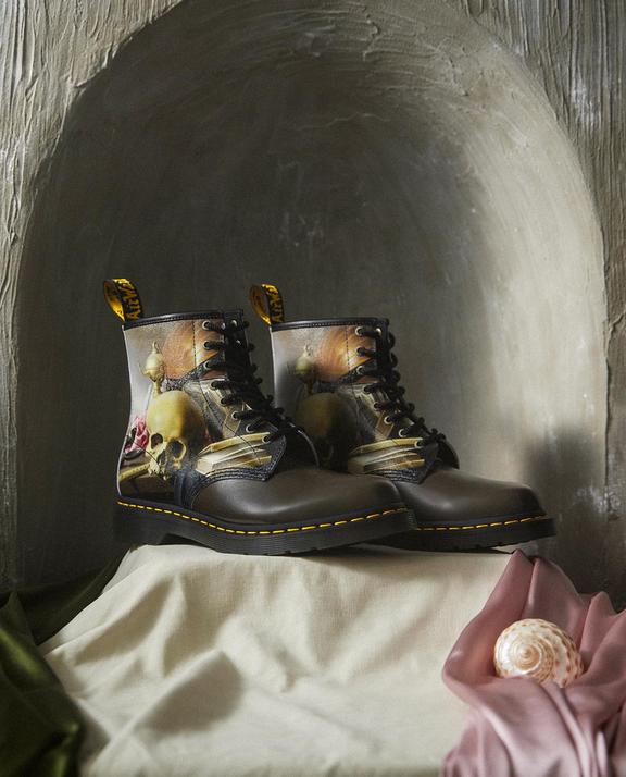 The Dr. Martens x The National Gallery: Harmen Steenwyck collection shines a light on Steenwyck’s most famous painting, ‘Still Life: An Allegory of the Vanities of Human Life’. Signature features of the 1460 boot form the foundation of the modified style: our classic 8-eye silhouette. Still Life: An Allegory of the Vanities of Human Life Yellow welt stitching. Robust leather. Original soles. Steenwyck’s art is wrapped around the boot and finished off with surrounding black undertones, antique gold hardware and a dual-branded insole